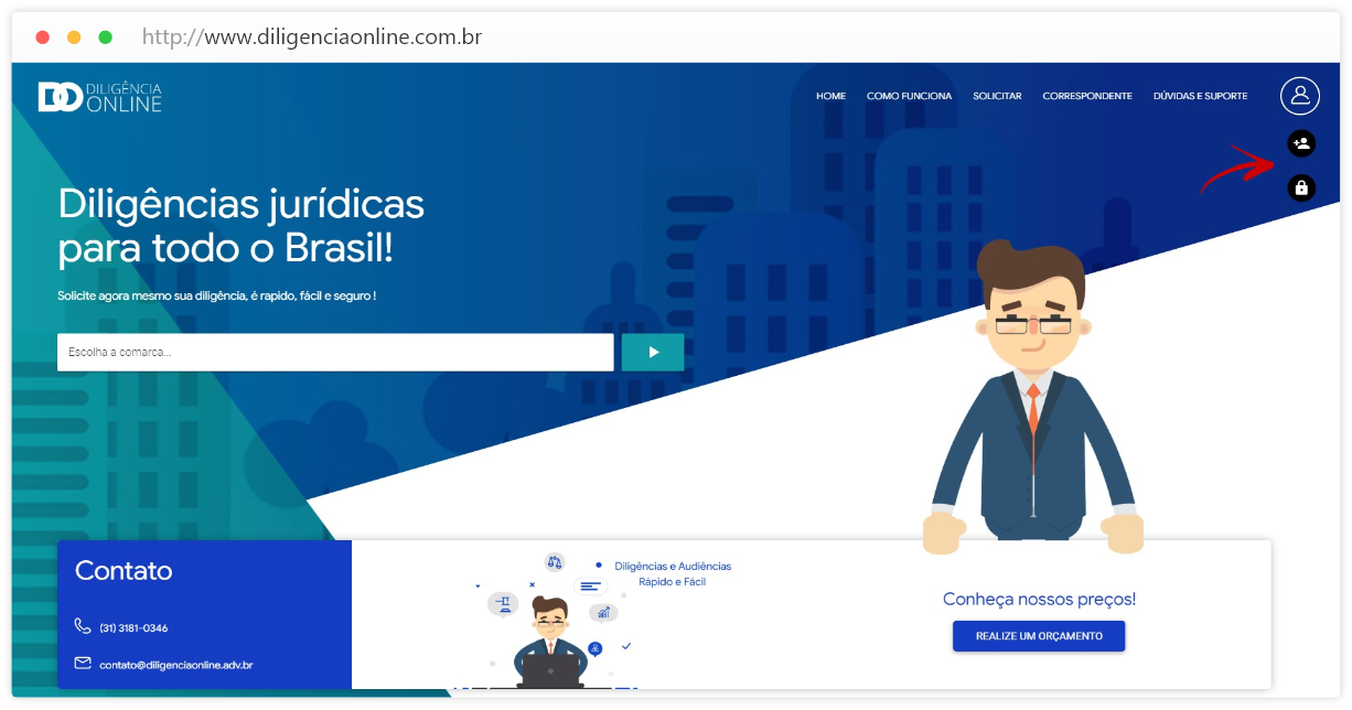 Clique no botão no canto superior direito e escolha a opção “Cadastrar” ou “Login”